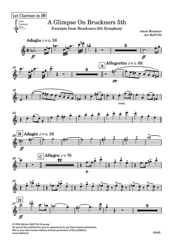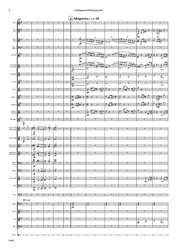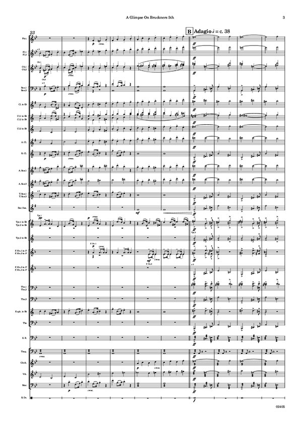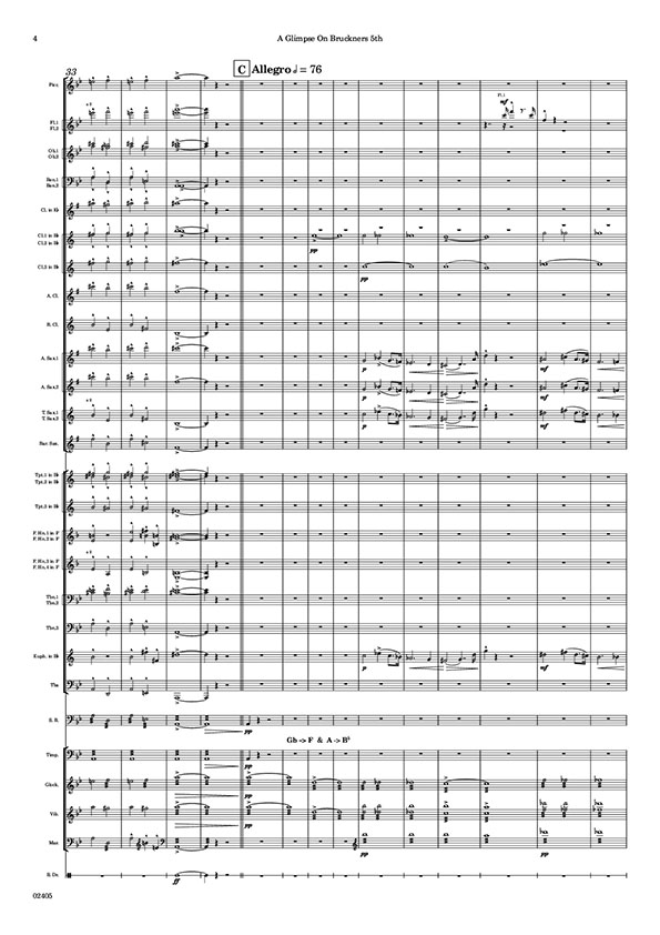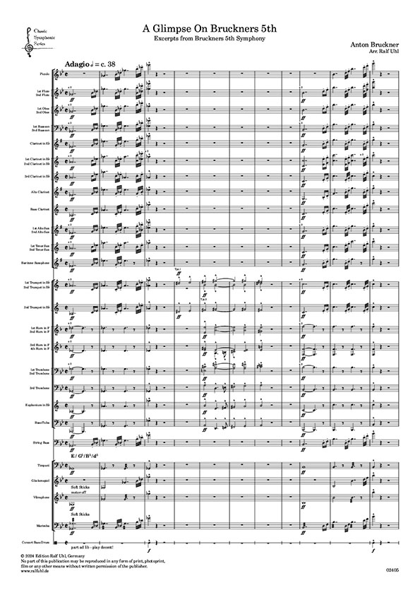 Dieses Arrangement, publiziert an seinem 200sten Geburtstag, möchte die Möglichkeit bieten, Bruckners Musik mit einem modernen Blasorchester zu spielen. Die Auszüge stammen aus dem ersten und dem zweiten Satz, sowie aus dem Finale.