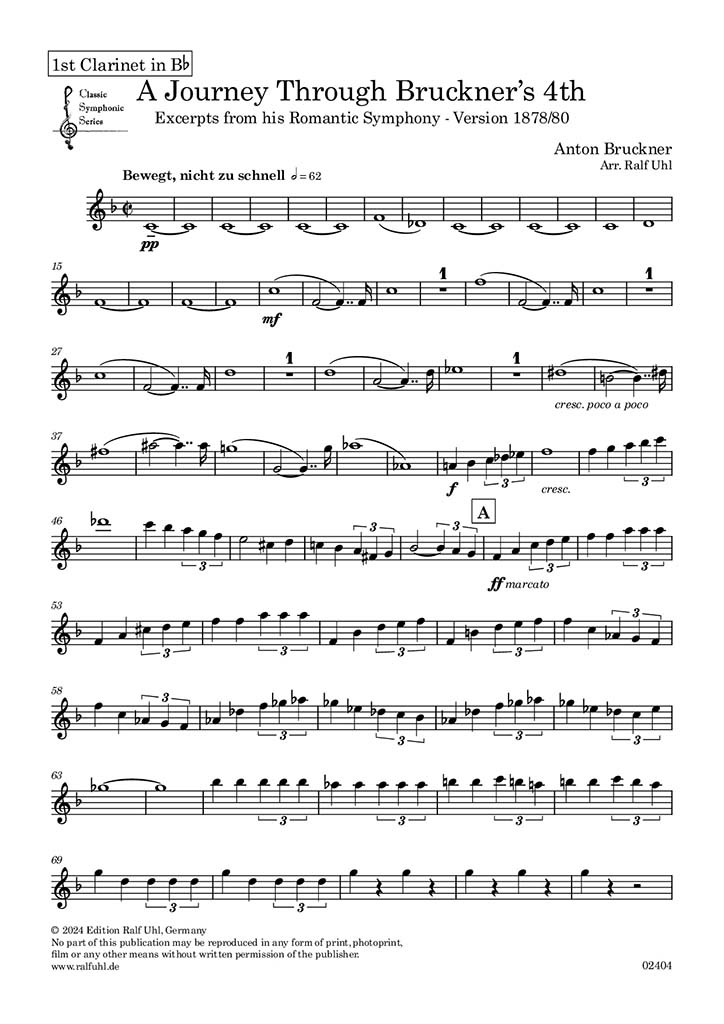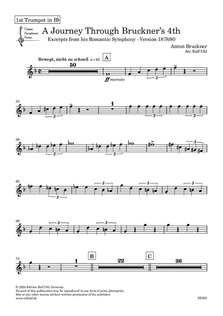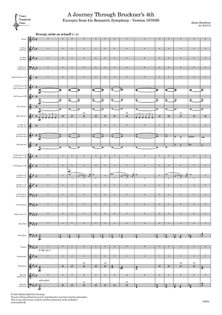 Dieses Arrangement, publiziert an seinem 200sten Geburtstag, möchte die Möglichkeit bieten, Bruckners Musik mit einem modernen Blasorchester zu spielen. Die Auszüge stammen aus dem ersten Satz und dem dritten Satz von der Fassung 1878, sowie aus dem Finale von 1880.